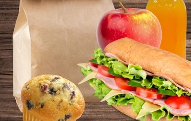 Sisältää tuhdin eväsleivän, mehun, makean palan ja hedelmän, ym.